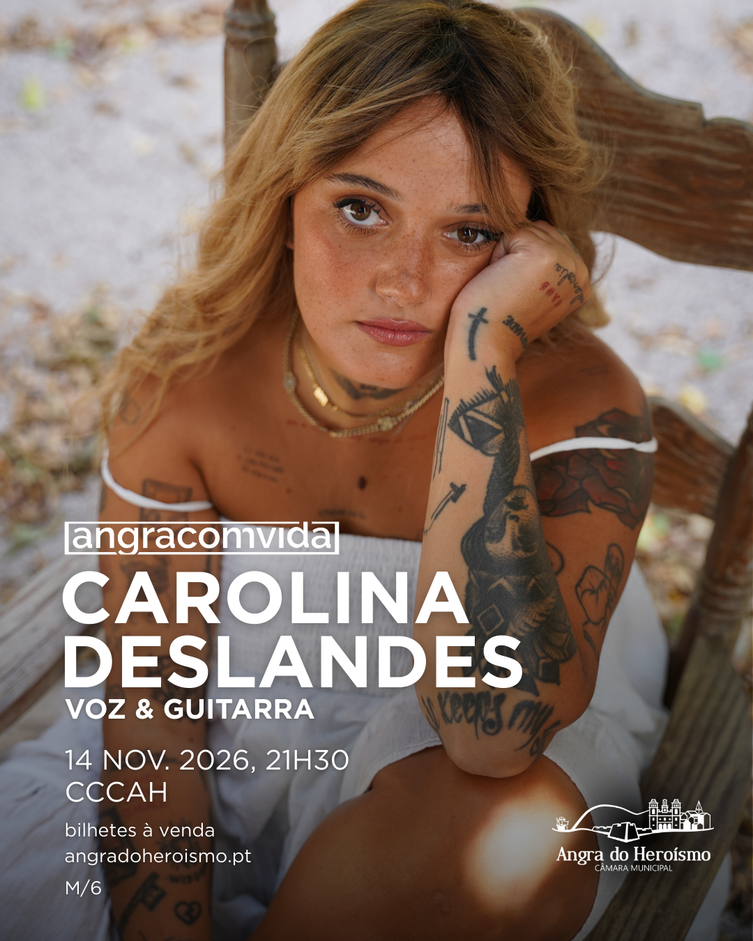 O Centro Cultural e de Congressos de Angra do Heroísmo acolhe, no dia 14 de novembro de 2026, sábado, às 21h30, o concerto «Angra Convida Carolina Deslandes – Voz & Guitarra». Carolina Deslandes é uma das maiores artistas da atual geração de cantores e compositores portugueses, com um percurso marcante na música nacional contemporânea. Neste espetáculo intimista, apresenta-se em duo voz e guitarra, acompanhada pelo guitarrista Feodor Bivol, interpretando canções do seu repertório num formato que privilegia a proximidade e a emoção.