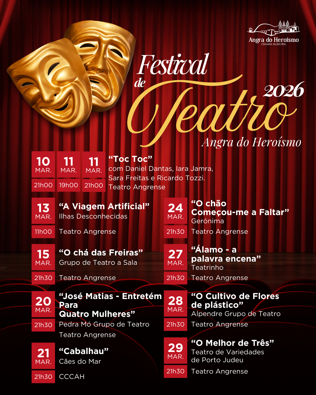 Angra do Heroísmo acolhe, durante o mês de março, o Festival de Teatro de Angra do Heroísmo 2026. Esta iniciativa reúne companhias e artistas para uma programação diversificada, celebrando o teatro nas suas múltiplas expressões e promovendo o encontro entre criadores e público.